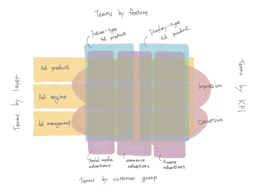 - 고객 기반 팀 구성: 고객 그룹을 기준으로 팀을 구성한다. e.g., 커머스 광고 팀