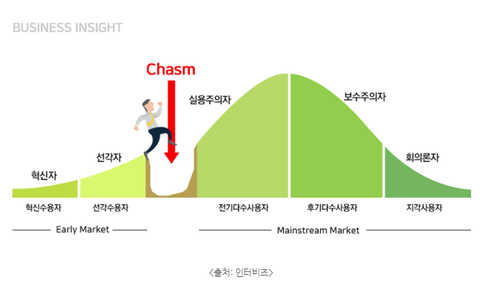 이 해설을 곧이곧대로 받아들인다면 A사 OOO가정간편식은 '캐즘(chasm)에 빠진 것이 문제'일 수 있다. 선도자 효과를 누리지 못할 때 생각해 볼 만한 이슈이다.