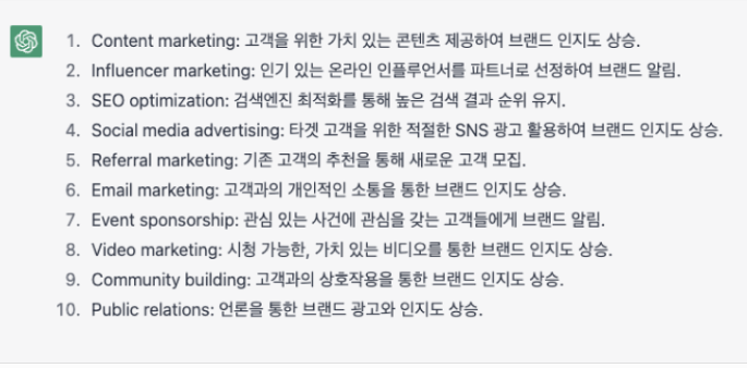 직장인들은 챗GPT를 통해 기획안 작성, 이메일, 요약, 아이디어 도출, 콘텐츠 제작 등 업무를 진행할 수 있습니다. 다음 시즌 마케팅 캠페인을 위한 아이디어 브레인스토밍을 시켜보겠습니다. 순식간에 다음과 같은 10개의 답을 얻을 수 있습니다.
