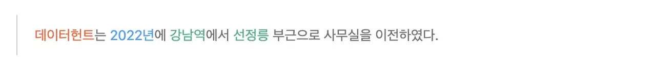 라는 문장에서 데이터헌트는 기관명, 2022년은 시간, 강남역과 선정릉은 지명으로 분류할 수 있습니다. 물론 정확한 의미 전달이 되지는 않지만 추출된 개체명만으로도 대충 어떤 내용의 문장인지 감이 오지 않나요? 이처럼 개체명 분류를 정확히 할 수 있다면 핵심적인 정보 추출에 매우 큰 도움이 됩니다.