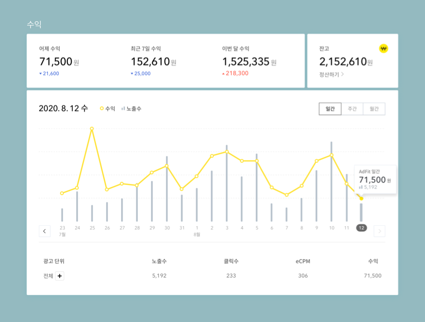 수익과 관련 통계를 바로 확인할 수 있습니다.