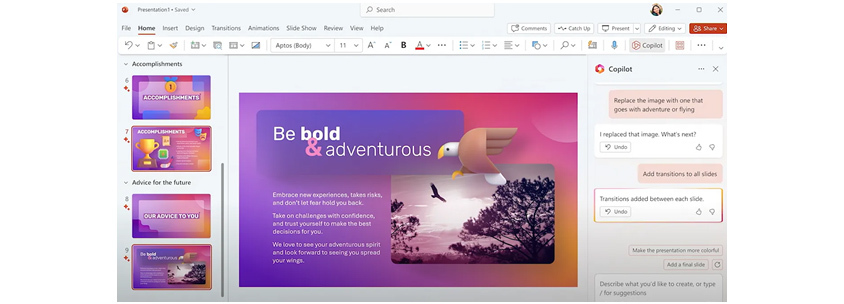 이를 위해서는 먼저, 대화라는 매개를 무조건적으로 사용하지 않고, 사용자의 목적과 인터랙션 순간에서 대화형 인터페이스가 다른 인터페이스에 비해 효율적으로 작동할 수 있는 상황을 정의하는 것이 우선이다. 나아가 대화로 시작했지만, 콘텐츠, GUI 등 다양한 유형의 모달과 인터페이스를 상호 보완적으로 활용하며, 사용자 경험을 풍부하게 만들어야 한다. 마이크로소프트 365의 코파일럿 기능은 대화형 인터페이스와 파워포인트 등의 문서 작업 등을 연동했고, 휘발성이 강한 대화형 인터페이스의 한계를 보완하여 요청의 결과물을 즉시 시각적으로 확인할 수 있게 했다. 대화, 작업의 대상이 되는 플랫폼, 버튼 인터랙션의 조화를 통해, 연속적인 사용자 경험 선상에서 적절하게 AI와 사용자가 협업하는 구조를 이뤄낸 것으로 훌륭한 결과라고 볼 수 있다.