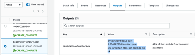 출력 탭 에서 LambdaHookFunctionArn나중에 QnABot에 삽입해야 하므로 기록해 둡니다 .