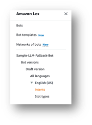 Amazon Lex 콘솔에서 봇으로 이동합니다 Sagemaker-Jumpstart-Flan-LLM-Fallback-Bot.