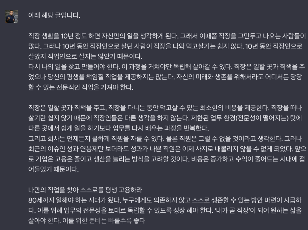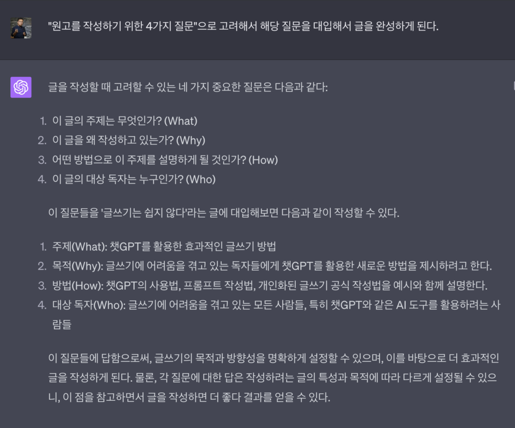 사실, 챗GPT와의 대화처럼 글쓰기 방식에 익숙해지고, 그것을 기존의 글쓰기 습관에 접목시키는 것은 상당한 시간이 필요하다. 이 과정을 통해 챗GPT는 글쓰기에서의 진정한 비서가 될 수 있다. 저도 몇 달의 노력 끝에 한 단계 발전했고, 이를 통해 나만의 글쓰기 공식을 찾아가고 있다.