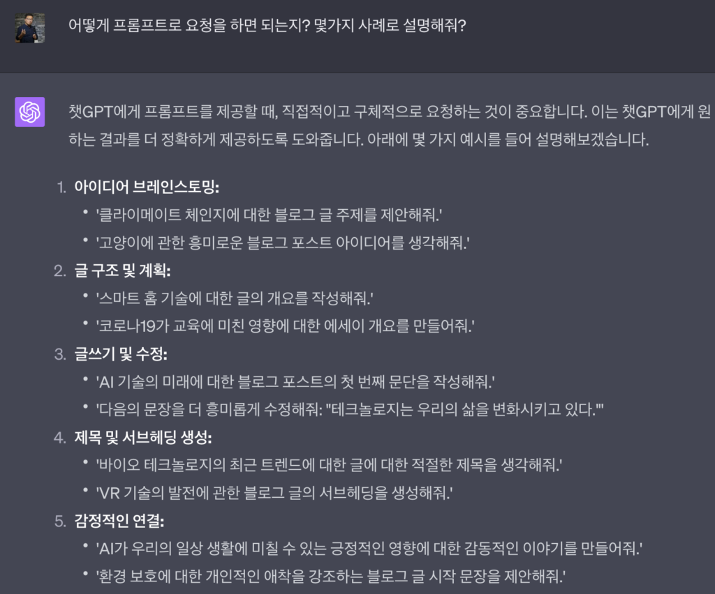 - 명확한 지시사항 제공: 챗GPT는 사용자의 명령에 매우 민감하게 반응한다. 따라서 가능한 한 구체적이고 명확하게 지시사항을 제공하는 것이 중요하다. 예를 들어, 글의 주제, 톤, 구조 등을 명확히 지시하면 챗GPT는 이에 따라 적절한 답변을 생성한다.