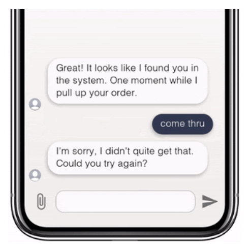이 챗봇 대화에서 사용자는 "come thru"로 응답하여 챗봇의 작업에 대한 승인을 표시하고 봇은 "죄송합니다. 잘 이해하지 못했습니다."라고 응답합니다. 이 봇을 설계한 사람은 다른 언어 스타일을 이해할 수 있는지 확인하지 않았으며, 이는 이 사용자에게 소외됩니다.