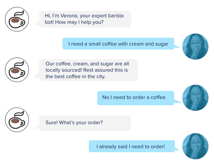 위의 이미지는 커피 바리스타 챗봇인 Verona Bot과 사용자 간의 대화 내용을 보여줍니다. 사용자는 자신을 반복해야 하고 좌절하게 됩니다.