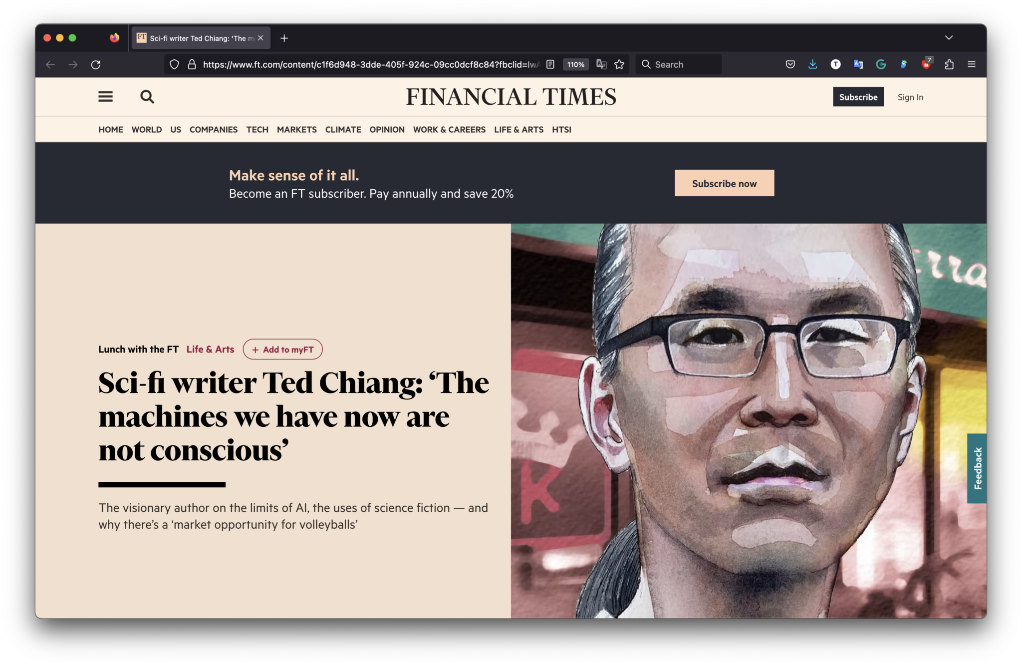 테드 창이 파이낸셜타임스와 인터뷰했다. 이 신문은 ‘FT와 점심을(lunch with the FT)’이라는 코너를 운영하고 있는데 기자가 테드 창에게 연락해서 점심을 먹자 했더니 사생활을 이야기하지 않는 조건으로 흔쾌하게 수락했다고 한다. 다음은 테드 창의 인터뷰 가운데 흥미로운 대목과 관련 기사들을 정리한 것이다.