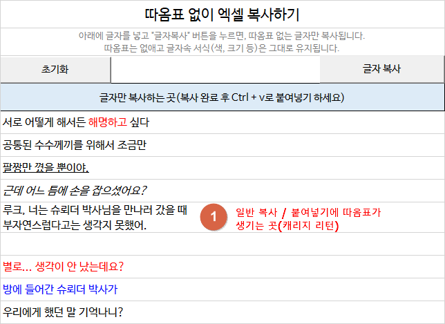 글꼴, 글꼴 크기, 밑줄, 글꼴 색상 등을 유지하면서, 따옴표를 없애 줍니다.