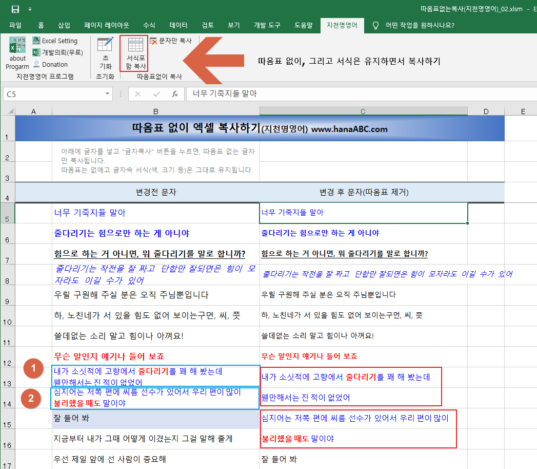 사용법은 아주 간단합니다. "변경전문자" 행에 원하는 글자를 붙여넣고, 리본메뉴 지천명영어 - 서식포함복사를 누르면 끝입니다.
