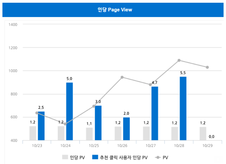 추천을 통해서 글을 여러개 본 경우에 대한 페이지뷰인데, 최소 2개의 글에서 많게는 5.5개의 글을 보고 나간 흔적이 있습니다. 이렇게 보는 사람 숫자가 적어서 과다 표집이 될 수도 있어요. 해당 블로그의 페이지뷰는 1000을 조금 넘는 수준이니까요.