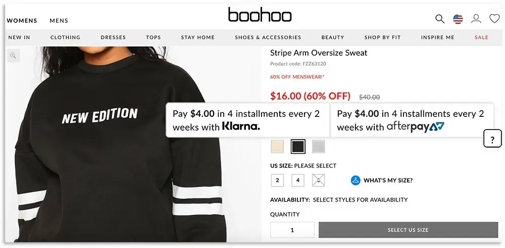 패션 소매업체 Boohoo는 고객이 안심하고 쇼핑할 수 있도록 검색 시점에 이러한 옵션을 명확하게 표시합니다. 지불 가능성에 대한 우려를 완화하기 위해 체크아웃의 지불 시점에서 망설이는 것처럼 보이는 모든 고객에게 지불 옵션 사용 프롬프트를 사용할 수도 있습니다.