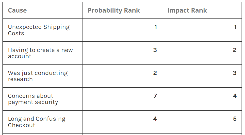 Barilliance는 이러한 데이터 세트를 분석하고 확률(방문자가 영향을 받을 가능성)과 영향(이 원인이 얼마나 중요한지)을 기준으로 장바구니 포기 원인 상위 10위 순위를 매겼습니다.