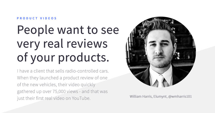 사람들은 여전히 제품에 대한 매우 실제적인 리뷰를 보고 싶어 합니다. 그들은 실제 상황에서 어떻게 견디는지 보고 싶어 합니다. 무선 조종 자동차를 판매하는 고객이 있습니다. 그들이 새로운 차량 중 하나에 대한 제품 리뷰를 시작했을 때 그들의 비디오는 순식간에 75,000회 이상의 조회수를 기록했습니다. 그리고 그것은 YouTube에서 그들의 첫 번째 실제 비디오였습니다. 이는 사이트에서 전환에 실제로 도움이 될 수 있는 브랜드 인지도를 구축합니다.