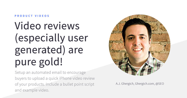 비디오 리뷰(특히 사용자 생성)는 순금입니다! 구매자가 제품에 대한 빠른 iPhone 비디오 리뷰를 업로드하도록 자동 이메일을 설정하십시오. 글 머리 기호 스크립트와 예제 비디오를 포함하십시오.