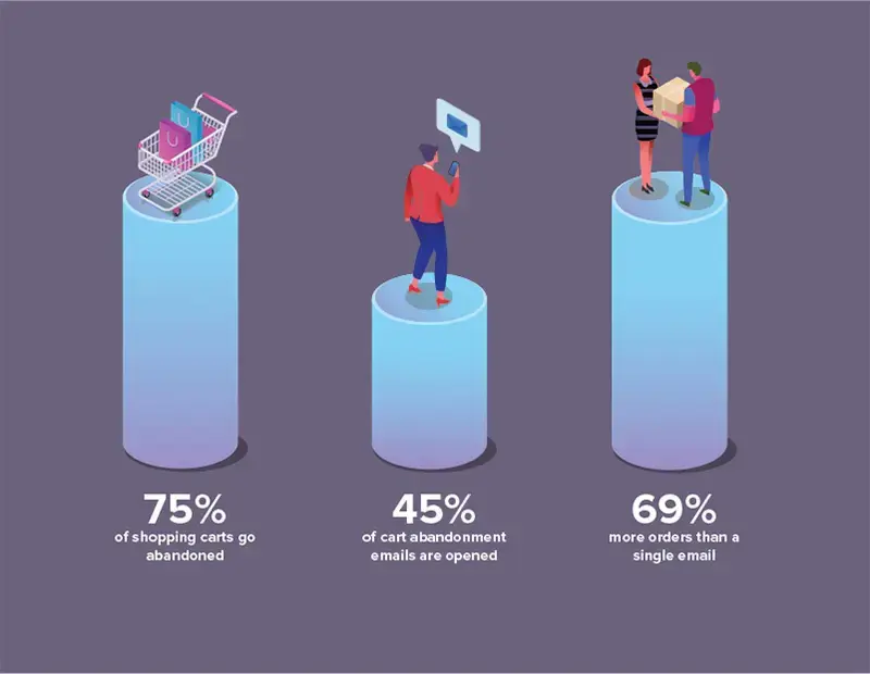 장바구니 포기 이메일은 표준 마케팅 이메일보다 19배 더 많은 구매를 증가시키므로 전자상거래 소매업체가 얻을 수 있는 것이 많습니다.