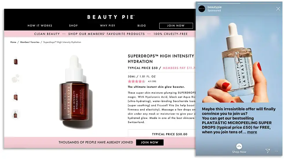 Beauty Pie의 리타겟팅 광고에는 웹사이트 방문자가 회원 전용 클럽에 가입하도록 설득하는 특별 제안이 포함되어 있습니다.