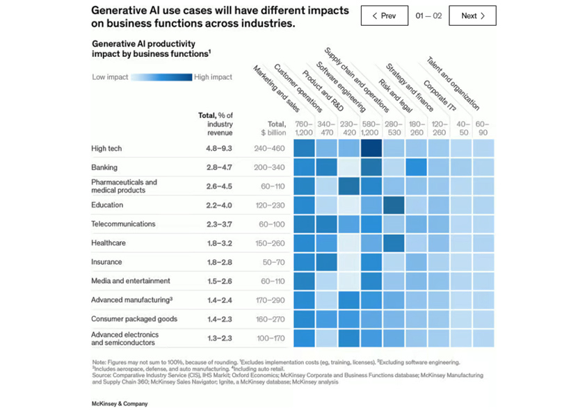 맥킨지의 최신 연구에서 16개 비즈니스 기능에서 63개 사용 사례를 분석한 결과, 생성형 AI는 생산성(비용 절감 포함)에 대한 영향으로 세계 경제에 연간 2.6조 달러에서 4.4조 달러 – 비교해 보면, 2021년 영국의 GDP는 3.1조 달러 수준 - 규모의 가치를 창출할 수 있다고 추정했습니다. 이는 모든 인공지능의 영향력을 15%~40%까지 증가시키는 것이며, 사용 사례 외 다른 기능까지 생성형 AI를 적용할 경우 약 두 배로 증가할 것으로 예상했습니다. 특히, 판매/마케팅, 고객 운영, 소프트웨어 개발, 연구/개발의 네 개의 기능은 생성형 AI 사용 사례가 제공할 수 있는 총 가치의 75%를 차지하며, 해당 기능의 역할을 변화시키고 성능을 향상시킬 것으로 예측했습니다. 전통적인 인공지능(AI)인 고급 분석 및 기계학습 알고리즘은 예측 모델링과 같은 숫자 및 최적화 작업을 수행하는 데 효과적이며 다양한 산업에서 새로운 응용 분야를 발견하고 있습니다. 그러나, 생성형 AI는 발전하고 성숙해짐에 따라 창의성과 혁신 측면에서 완전히 새로운 지평을 열 수 있는 잠재력이 있으며, 이미 기존의 전통적인 AI가 달성할 수 있는 가능성을 확장시키고 있습니다. 생성형 AI의 능력은 본질적으로 자연어를 이해하고 인지적인 작업을 수행하도록 설계되었기 때문에 지식 업무에 가장 큰 영향을 미칠 것이며, 자동화 잠재력이 낮았던 의사 결정과 협업과 관련된 업무의 생산성에 큰 영향을 줄 것입니다.
