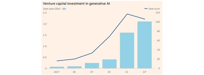 수년간의 팬데믹과 공급망 쇼크, 국가 간의 분쟁, 전 세계 인플레이션과 같은 글로벌 위기가 해마다 이어지고 있지만, 기업들은 인공지능과 자동화 이니셔티브를 통해 비즈니스 생존력을 확보하고 앞으로의 위기에 대처하려고 하고 있습니다. 이러한 측면에서, 생성형 AI(Generative AI) 시장은 새로운 모델과 애플리케이션 개발을 위한 투자가 증가하면서 급속한 성장을 경험하고 있으며, 벤처 자본가들은 생성형 AI 관련 신생 기업에 투자를 서두르고 있습니다. 글로벌 AI 투자는 2021년 935억 달러로 급증했으며, 2028년까지 4,223억 7천만 달러에 이를 것으로 예상하고 있습니다. 파이낸셜 타임즈에 따르면, 생성형 AI 분야에 2020년 이후 425% 증가하여 2022년에 이미 20억 달러 이상이 투자되었습니다.