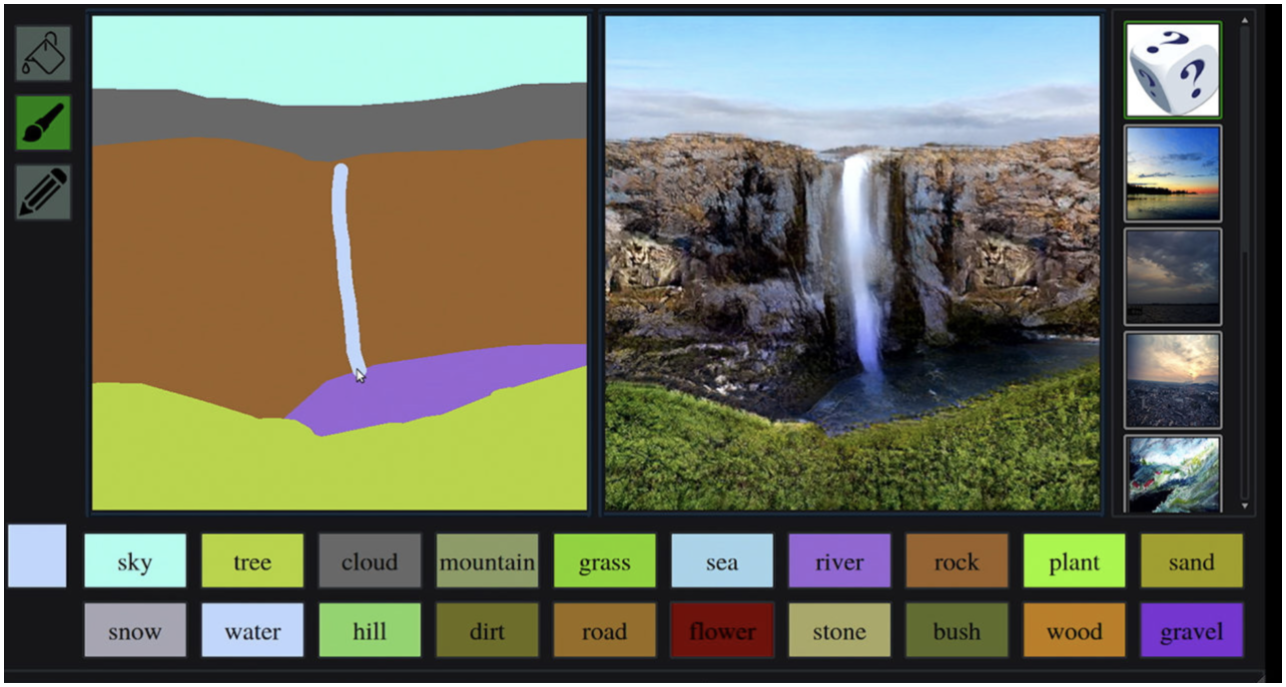 사용자들은 GauGAN으로 분할 지도를 그리고 장면을 조정해 모래, 하늘, 바다, 눈 등으로 영역별 라벨링을 할 수 있습니다.