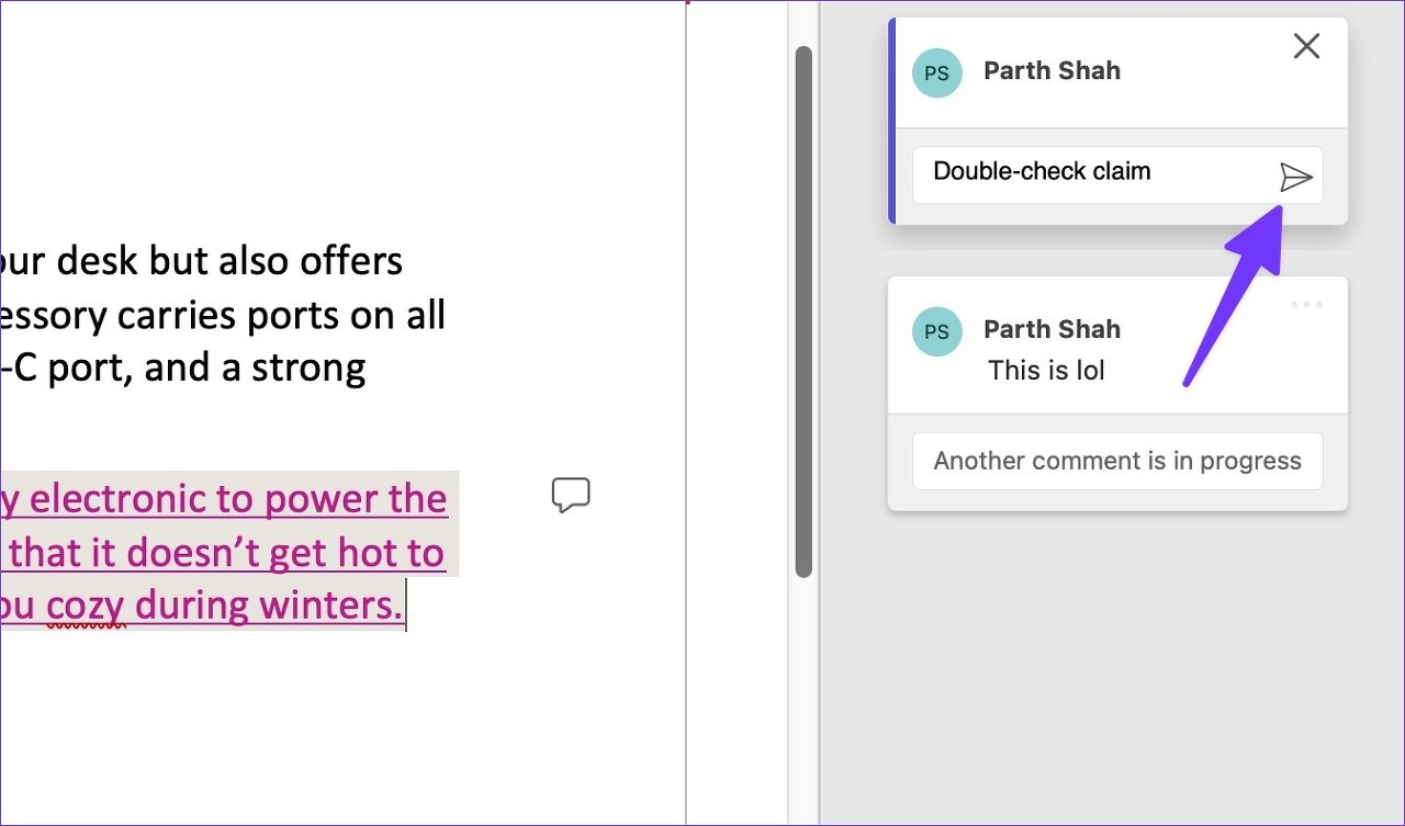3단계: 의견을 입력하고 보내기 버튼을 선택합니다. Word는 다른 사람들이 주석을 확인할 수 있도록 텍스트나 단락을 강조 표시합니다.