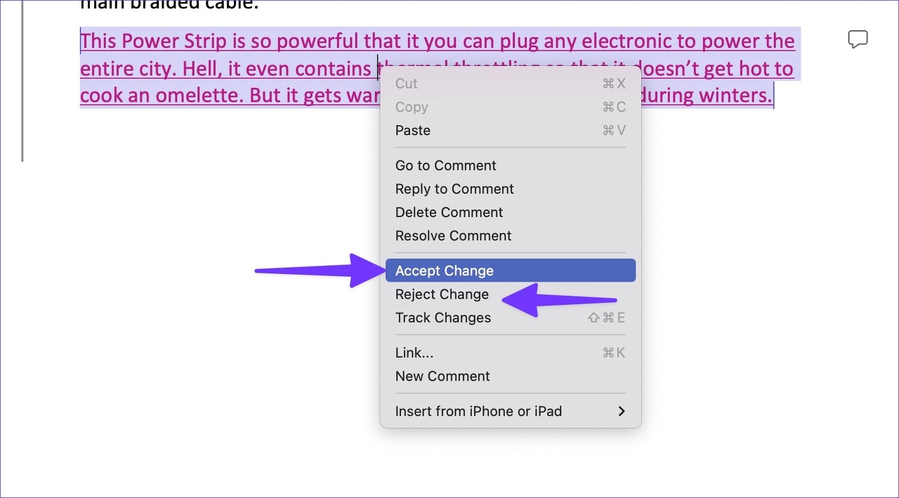 3단계: 텍스트를 마우스 오른쪽 버튼으로 클릭하고 변경 수락 또는 변경 거부를 선택합니다.