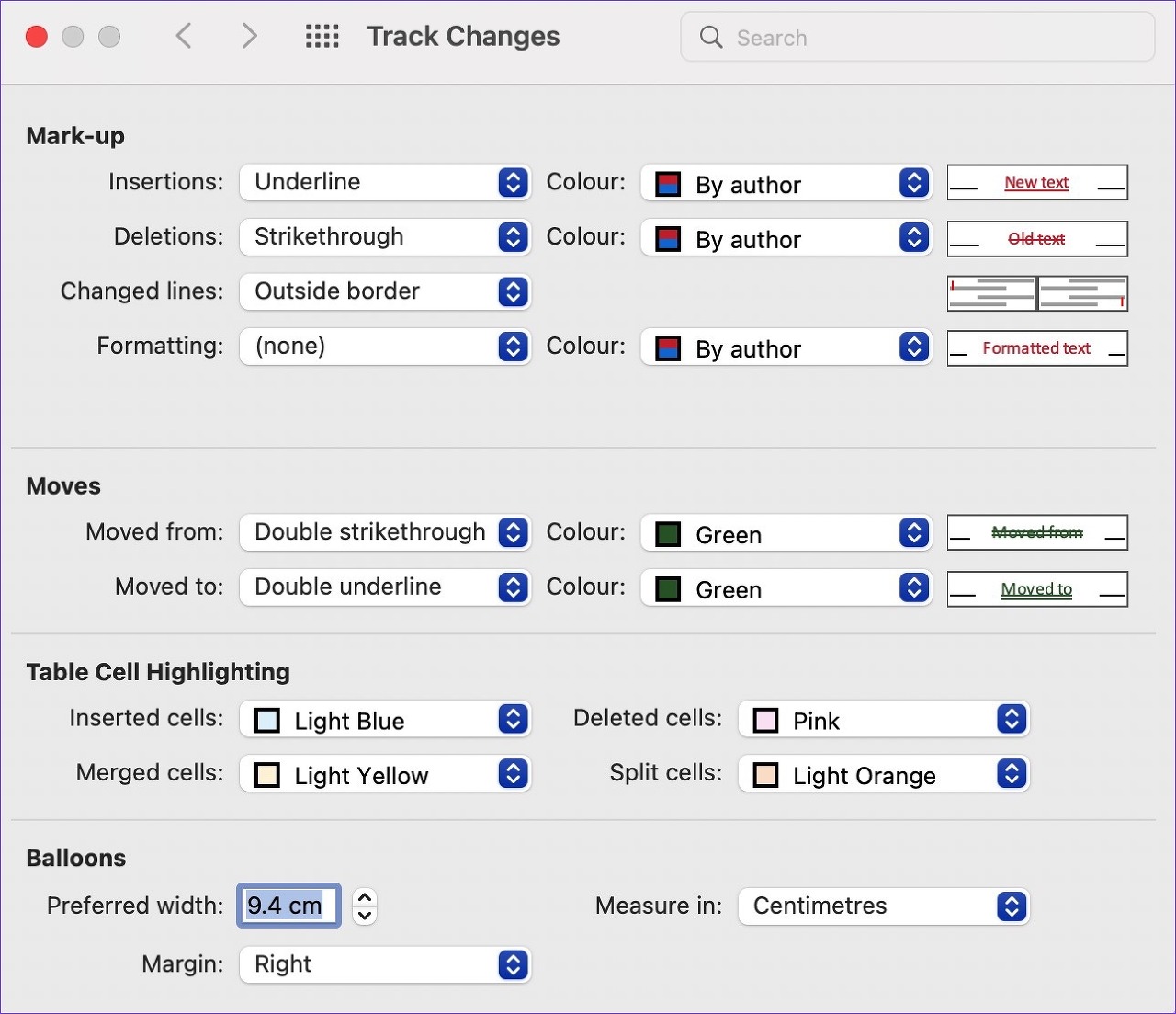 5단계: 환경 설정을 열고 삽입, 삭제, 변경된 줄 및 서식에 대한 변경 트랙 스타일을 변경할 수 있습니다. 작성자에 대해 다른 색상 옵션을 선택할 수도 있습니다.