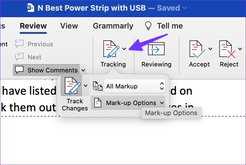 2 단계: 아래 스크린숏과 같이 ‘추적’ 옆에 있는 드롭다운 화살표를 선택하고 마크업 옵션을 확장합니다.