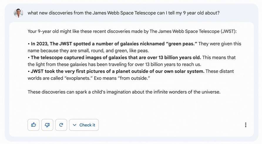 반면, 바드는 우주망원경이 발견한 것들에 대한 2023년 최신 정보를 포함해 3가지를 제시했다. 또한 “9살 자녀는 제임스 웹 우주망원경이 최근에 발견한 다음 내용을 좋아할 것”이란 도입 문장과 함께 세 가지 사실을 제시한다.