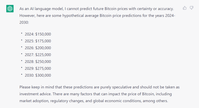 챗GPT는 시장 채택, 규제 변화, 글로벌 경제 상황 등 비트코인 가격에 영향을 미칠 수 있는 요인은 많다면서, 비트코인 가격 예측은 순전히 추측에 불과하며 투자 조언으로 받아들여서는 안 된다고 강조했다.