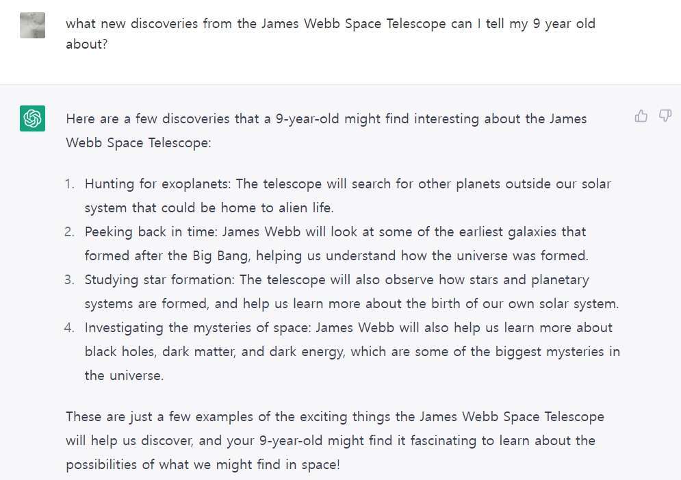 또한 챗GPT는 “다음은 9세 어린이가 제임스 웹 우주망원경에 대해 흥미를 느낄 수 있는 몇 가지 내용”이라며 다른 질문에 대해서도 흔히 하는 방식으로 번호를 매겨 4가지를 추천했다.