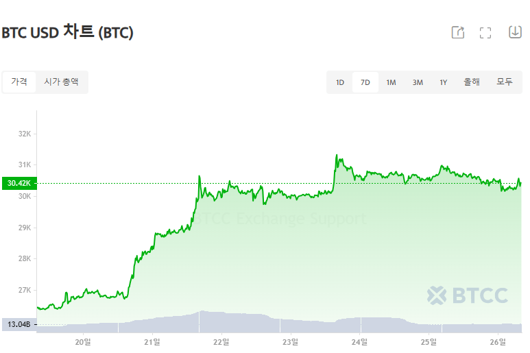 한편, 26일(현지시간) 글로벌 암호화폐 거래소 BTCC 거래소 자료에 따르면 비트코인은 현재 기준으로 24시간 전 대비 0.94% 하락한 30,493달러에 거래되고 있다. 이는 일주일 전보다 15.48% 오른 가격이다.