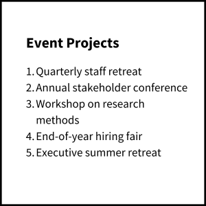 책임을 작은 프로젝트로 나누면 프로젝트 목록이 지속적으로 바뀌게 됩니다. 이러한 회전율은 프로젝트를 성공적으로 완료할 때마다 축하할 수 있는 정기적인 승리의 흐름을 만듭니다. “이벤트”의 광범위한 영역을 실행 중인 각 개별 이벤트로 세분화하면 얼마나 동기 부여되고 성취감을 느낄지 상상해 보세요.