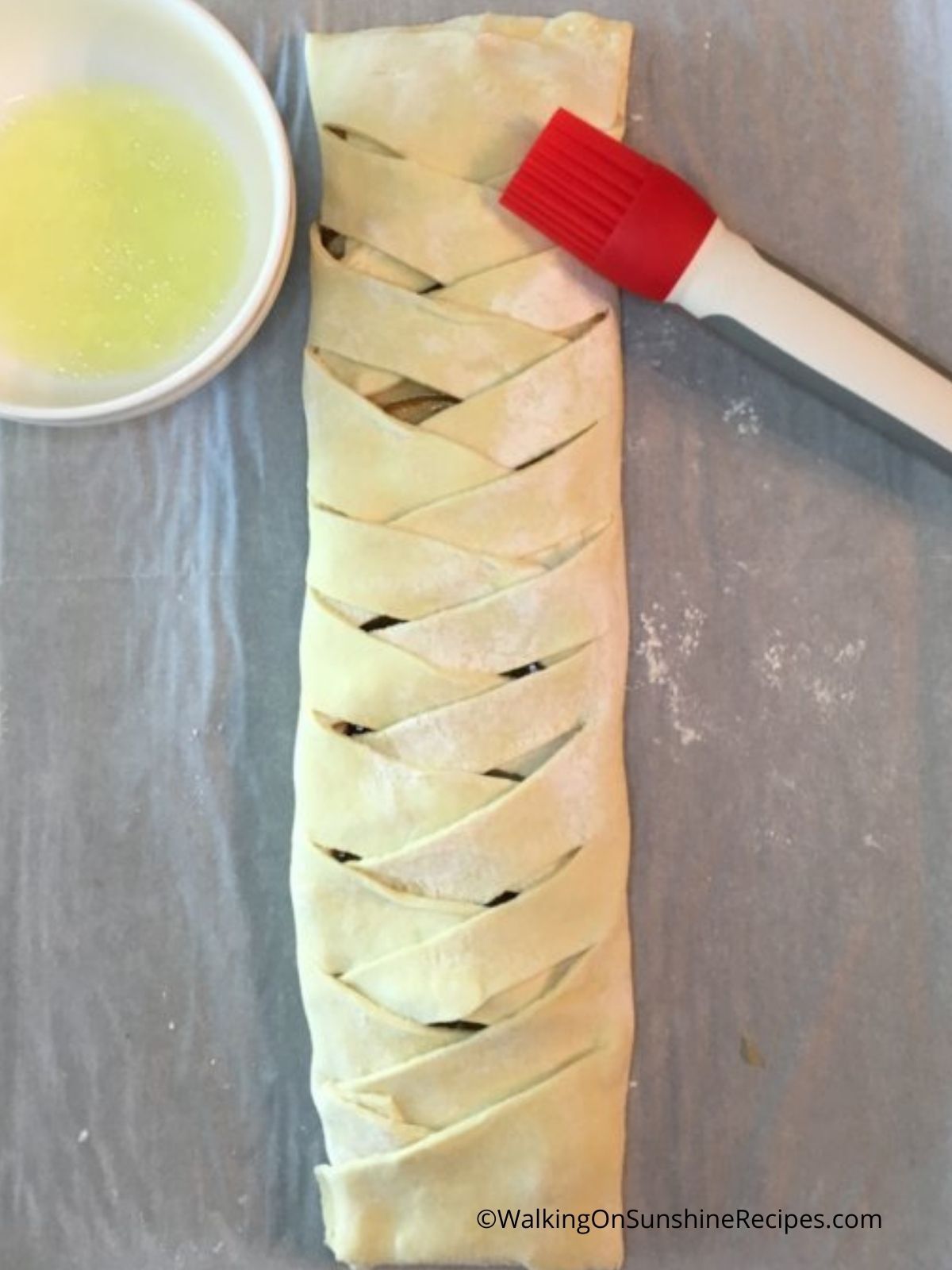 - 4๋จ๊ณ: ํผํ ํ์ด์คํธ๋ฆฌ๋ฅผ ์ ์ฐ์ง์ ํจ๊ป ๋ฒ ์ดํน ํธ๋ ์ด์ ์ฎ๊น๋๋ค. ํผํ ํ์ด์คํธ๋ฆฌ ์ค์์ ํฌ๋ฆผ์น์ฆ๋ฅผ ๋ฐ๋ผ์ฃผ์ธ์. ํฌ๋ฆผ์น์ฆ ํผํฉ๋ฌผ ์์ ์ฌ๊ณผ ์กฐ๊ฐ์ ๋ฐฐ์ดํฉ๋๋ค.