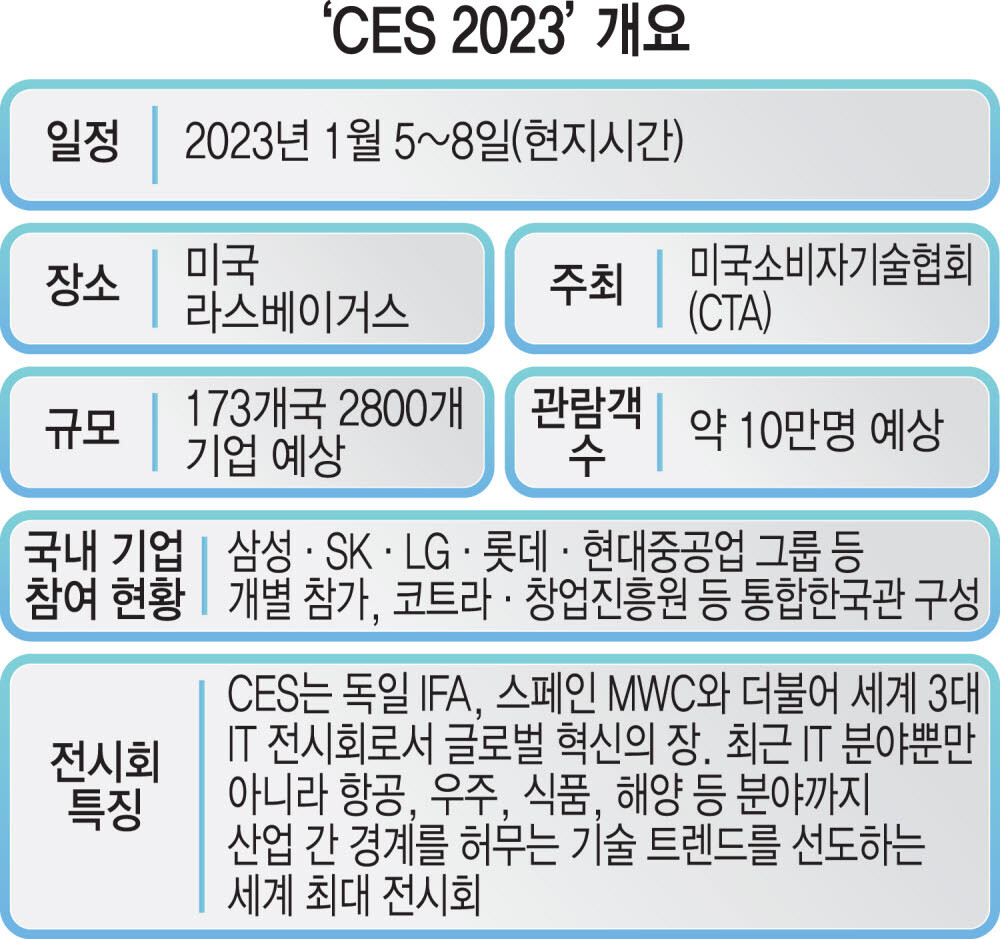 세계 최대 정보기술(IT)·가전 전시회 'CES 2023'이 열흘 앞으로 다가왔다. CES 2023은 새해 1월 5일(현지시간) 나흘 일정으로 미국 라스베이거스에서 막을 올린다. 가전, 모바일, 모빌리티, 로봇 등 IT·가전 전 영역에 걸친 최신 제품과 미래 기술이 총집합한다. 삼성·SK·롯데·현대중공업그룹 등 주요 한국 기업들도 참가, 경쟁력 있는 기술을 선보였다.