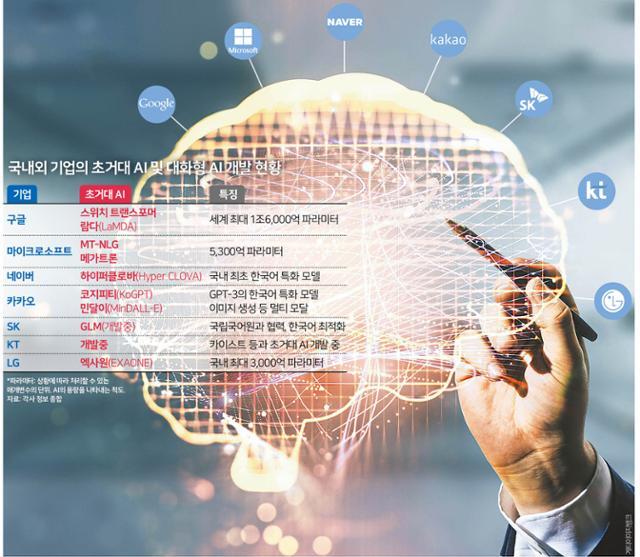 학계, 연구기관과 대기업의 연합전선도 구축됐다. SK는 지난해 5월 SK텔레콤 산하에 태스크포스를 설치하고 국립국어원과 함께 GPT-3을 기반으로 초거대 AI 개발에 한창이다. 최근에는 AI 비서 A.(에이닷)을 발표하기도 했다. KT는 한국전자통신연구원(ETRI)·한국과학기술원(KAIST) 등과 함께 2,000억 파라미터 규모의 초거대 AI를 개발 중이다.