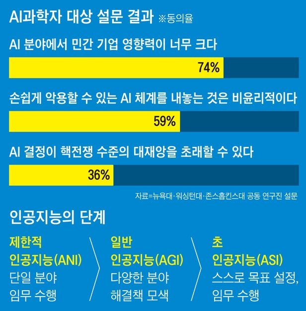 뉴욕대·워싱턴대·존스홉킨스대 등의 공동 연구진이 최근 코넬대의 논문 사전 공개 사이트 아카이브에 밝힌 연구 결과에 따르면, AI 분야의 ‘자연어 처리(NLP·Natural Language Processing)’ 과학자 327명을 대상으로 한 심층 설문에서 36%가 ‘AI가 내린 결정이 전면 핵전쟁 같은 대재앙을 이번 세기에 일으킬 수 있다’에 동의했다.
