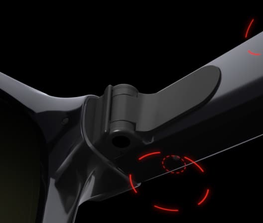 전원 켜기/끄기 스위치는 안경의 왼쪽 다리 힌지 옆에 있습니다.