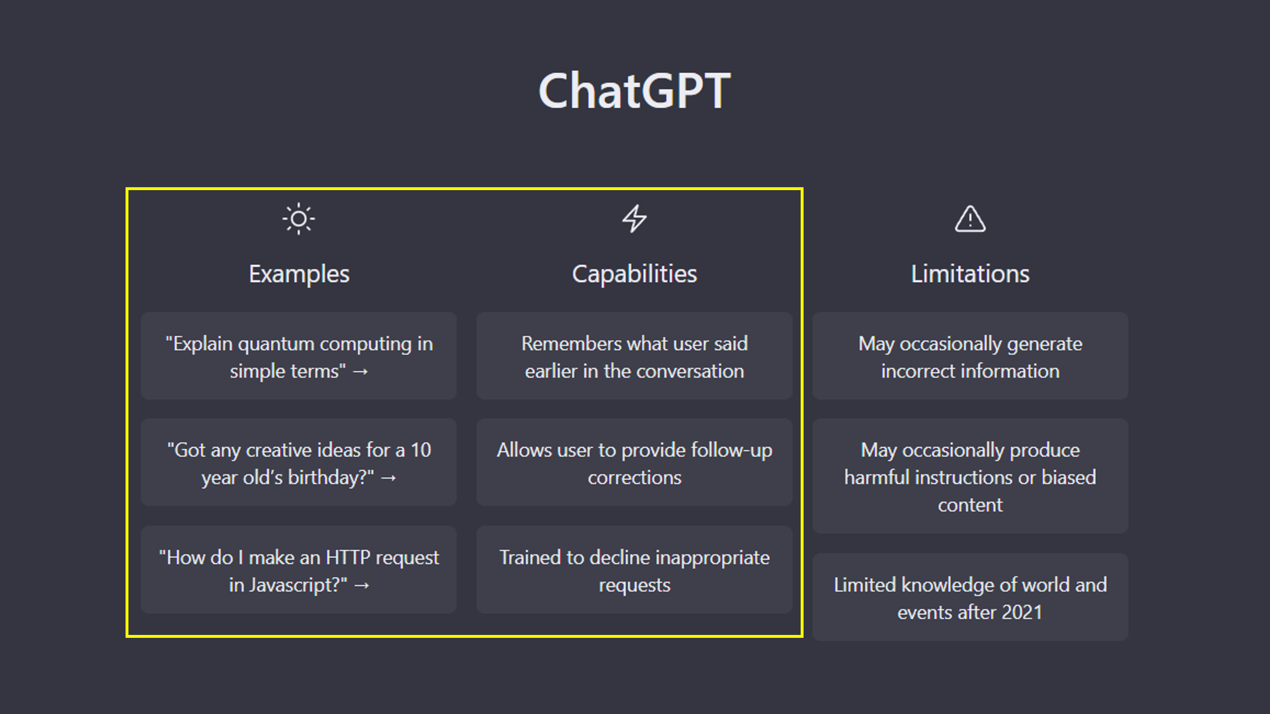 OpenAI는 ChatGPT 서비스 웹페이지를 통해 사용 예시와 능력에 관해 설명하고 있습니다.