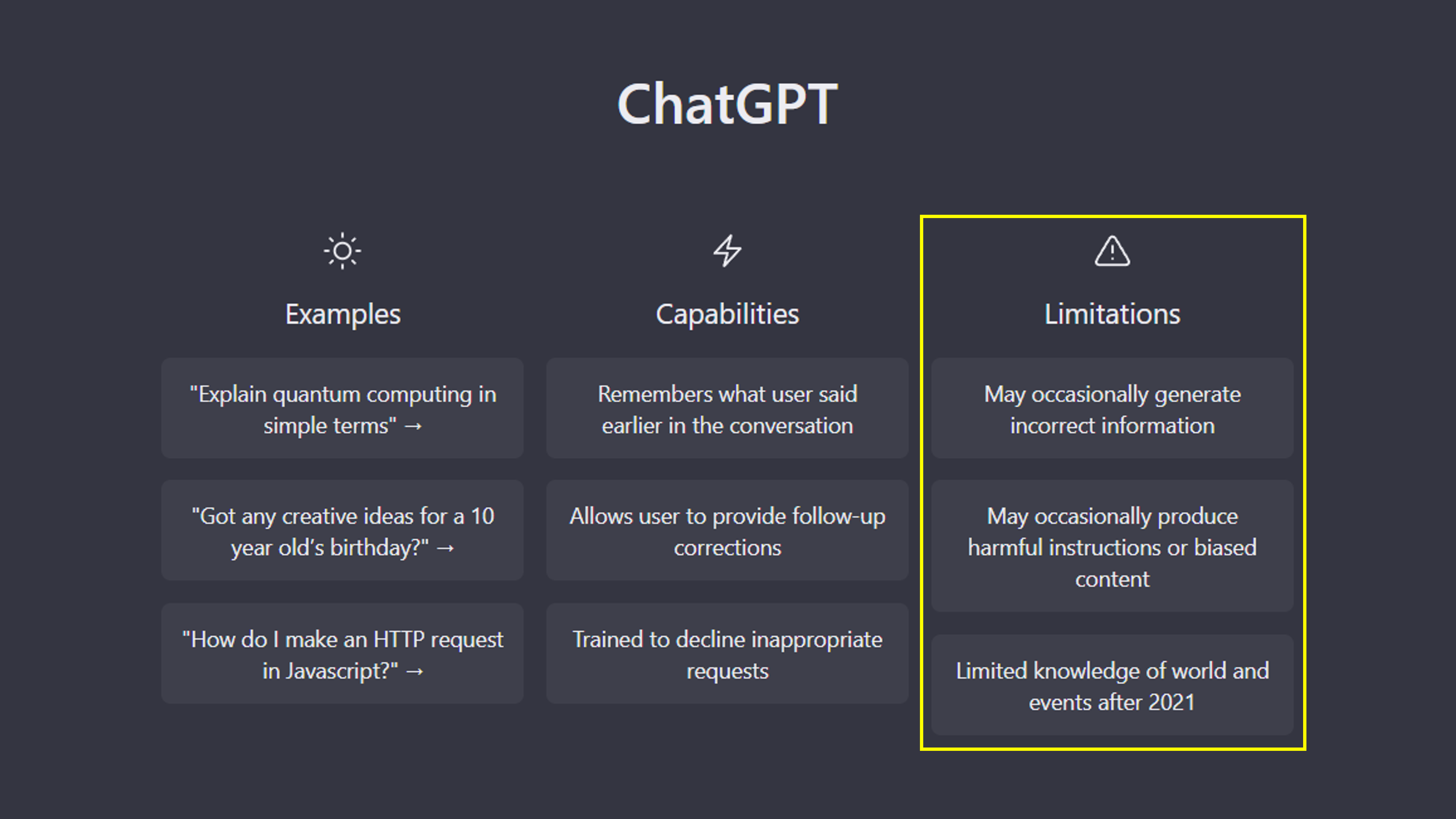 ChatGPT가 이전보다 굉장히 진보된 모델이고, 놀라운 가능성을 보여줬다는 것은 분명합니다. 한편 여전히 기존 모델들이 보여준 문제점과 한계를 가지고 있기도 하죠. ChatGPT 웹페이지의 설명에서도 한계로서 부정확한 정보를 생성하거나(May occasionally generate incorrect information), 유해하고 편견이 있는 내용이 포함되거나(May occasionally produce harmful instructions or biased content), 세상에 대해 제한된 지식만 가지고 있음(Limited knowledge of world and events after 2021)을 밝히고 있습니다.