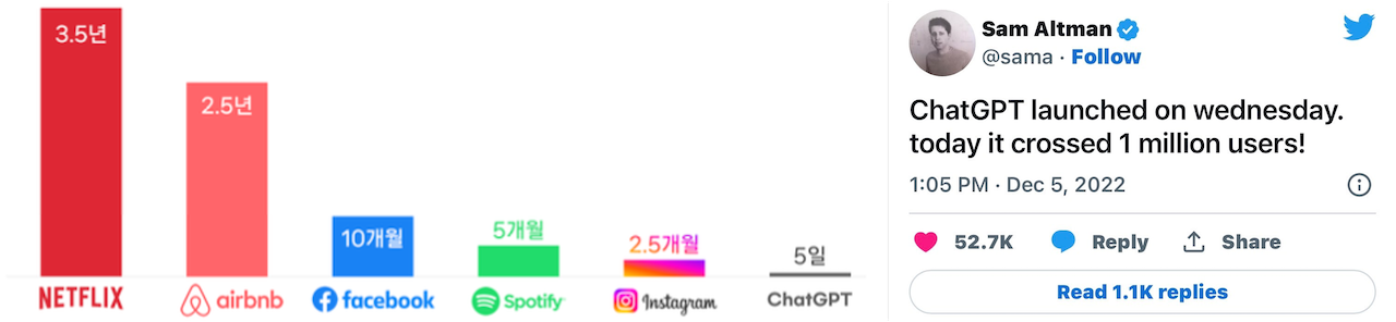 이상은 순서대로 넷플릭스(Netflix), 페이스북(Facebook), 스포티파이(Spotify), 인스타그램(Instgram)이 100만 사용자를 달성하기까지 걸린 시간입니다. 그런데 얼마 전 이 쟁쟁한 서비스들의 기록을 단숨에 갈아치운 새로운 슈퍼스타가 등장했죠. 바로 출시 5일만에 이들을 뛰어넘어 버린 OpenAI의 ChatGPT입니다.