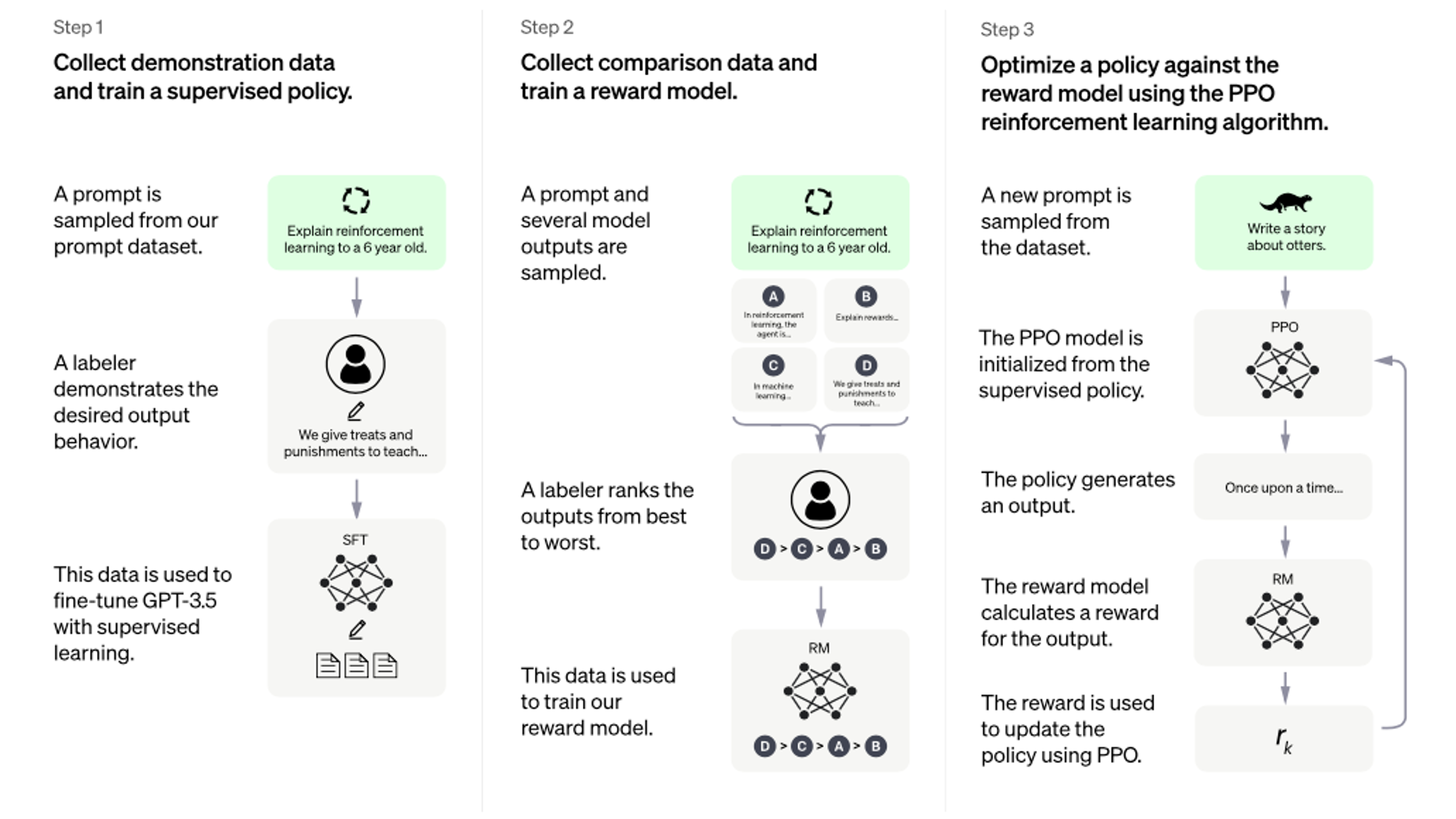 RLHF를 활용한 ChatGPT의 학습 방법, 출처: OpenAI Blog