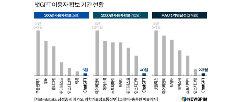 생성형 AI라는 화두를 세상에 쏘아 올린 것은 OpenAI사의 ChatGPT로 GPT-3.5(Generative Pre-trained Transformer) 모델을 기반으로 ‘22년 11월에 출시되었습니다. GPT*는 딥러닝을 사용하여 인간과 유사한 텍스트를 생성하는 대규모 자연어 기술입니다. ChatGPT는 5일 만에 이용자가 100만 명이 넘었고 40일 만에 1,000만 명이 가입했으며, 또 두 달 만에 1억 명을 훌쩍 뛰어넘은 이용자를 기록했습니다. 100만 명의 이용자를 확보하는데 Apple iPhone은 두 달 이상이 걸렸고, Facebook은 10개월, Netflix는 3년 이상이 걸렸으니. 일각에서는 ChatGPT를 '괴물'로 표현하기까지 합니다. 출시 이후, OpenAI는 4개월 만에 GPT-4라는 새로운 대형언어모델(LLM, Large Language Model)을 출시했으며, 이 모델은 뚜렷하게 개선된 능력을 갖추고 있습니다. GPT-4는 사진 속 사람의 손 글씨나 메모를 인식해 사용자의 요청을 수행하고, 지정한 대로 PPT 자료를 만들어 주는 것은 물론 냉장고 속 재료 사진만으로 요리 레시피를 소개합니다. 또한, 변호사 자격시험에 합격하고 미국 생물학 올림피아드에서 87점(상위 1%)의 성적을 낼 정도로 똑똑해졌습니다. OpenAI는 GPT-4에 대해 "인간의 수준을 가졌다"라고 자평했고, 일반 대화에서도 인간과 큰 차이를 느끼지 못하는 수준이 되었습니다.