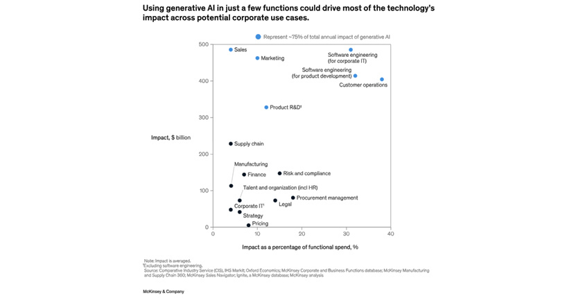 맥킨지의 최신 연구에서 16개 비즈니스 기능에서 63개 사용 사례를 분석한 결과, 생성형 AI는 생산성(비용 절감 포함)에 대한 영향으로 세계 경제에 연간 2.6조 달러에서 4.4조 달러 – 비교해 보면, 2021년 영국의 GDP는 3.1조 달러 수준 - 규모의 가치를 창출할 수 있다고 추정했습니다. 이는 모든 인공지능의 영향력을 15%~40%까지 증가시키는 것이며, 사용 사례 외 다른 기능까지 생성형 AI를 적용할 경우 약 두 배로 증가할 것으로 예상했습니다. 특히, 판매/마케팅, 고객 운영, 소프트웨어 개발, 연구/개발의 네 개의 기능은 생성형 AI 사용 사례가 제공할 수 있는 총가치의 75%를 차지하며, 해당 기능의 역할을 변화시키고 성능을 향상할 것으로 예측했습니다.