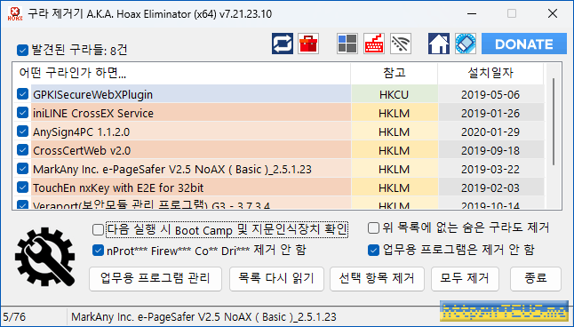 PC에 설치된 프로그램들 중에 제거해야 될 프로그램들의 목록을 띄워준 것이다.