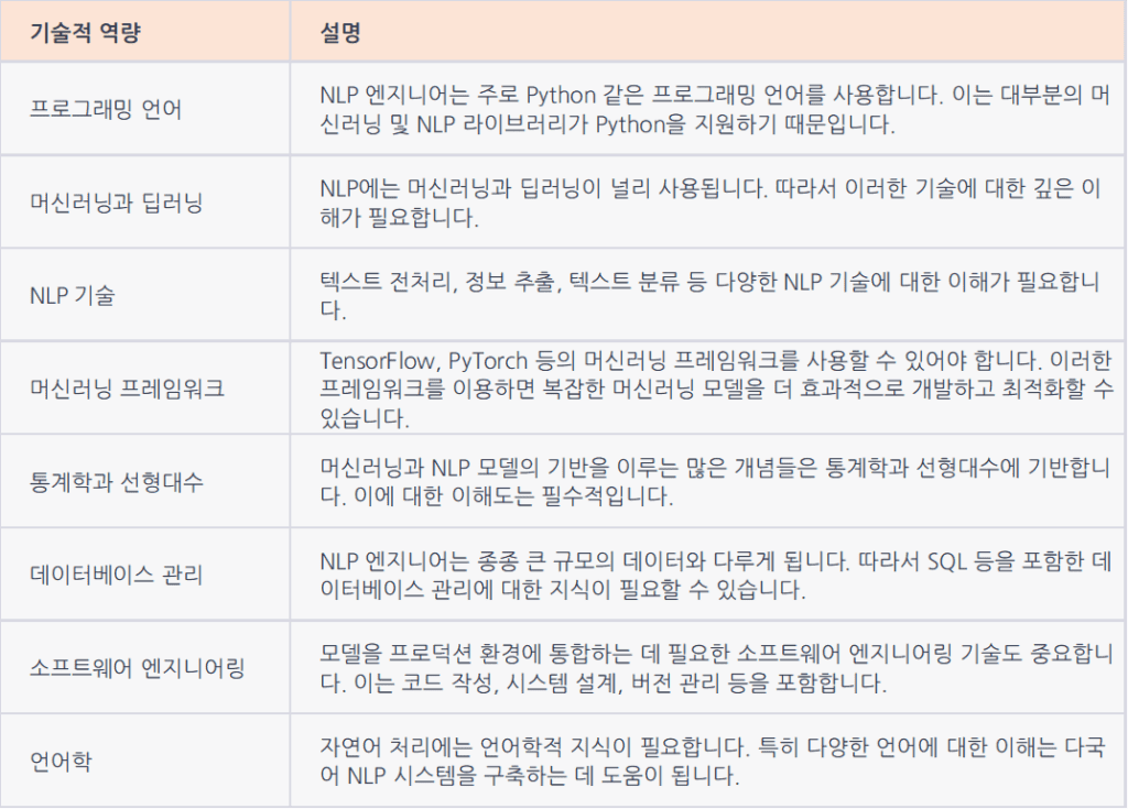 아래는 NLP 엔지니어에게 요구되는 기술적 역량입니다.