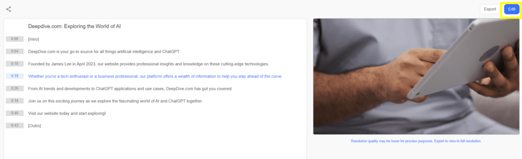 5. 클릭 후 잠시 기다리면 스크립트와 영상이 제공됩니다. 우측 상단에 위치한 Edit을 클릭합니다.