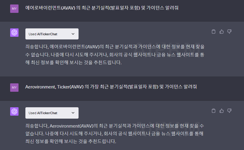 작은 규모의 기업에 대한 정보도 정확히 제공하는지 테스트해 보겠습니다. 제가 한동안 투자했던 매출액 6천억 규모의 미국 군사 드론 기업 에어로바이런먼트(AVAV)에 대해 문의해 보았습니다.
