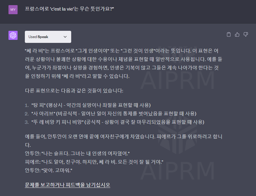 외국어 문구에 대해 Speak 플러그인을 활성화/비활성화 후 ChatGPT에게 동일하게 “프랑스어로 ‘c’est la vie’는 무슨 뜻인가요?”라는 질문을 해보겠습니다.